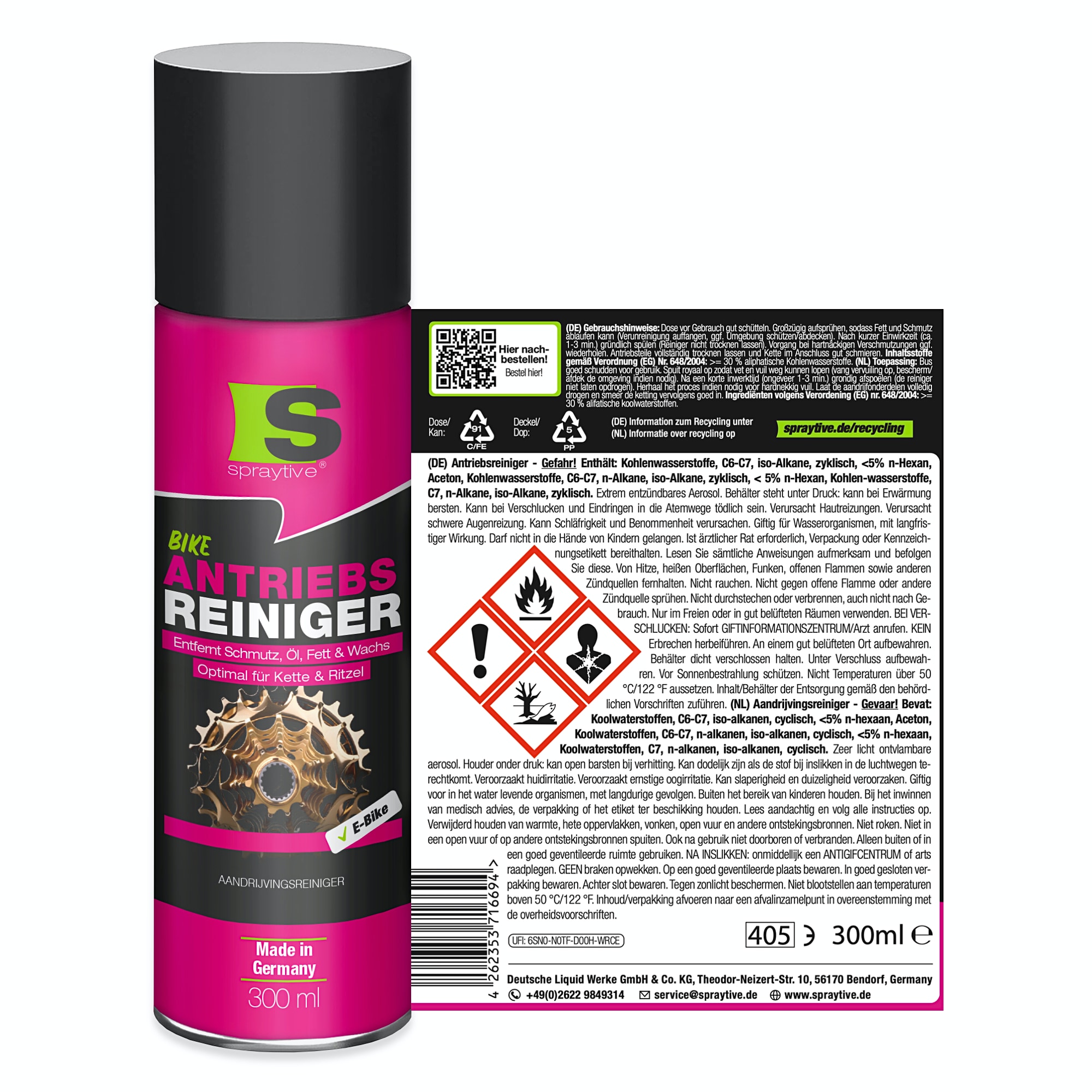 Der Spraytive Antriebsreiniger löst hartnäckige Verschmutzungen, Öl-, Fett- und Wachsablagerungen von Kette, Ritzel und Schaltkomponenten. Durch den Sprühdruck der Aerosoldose werden auch Schmutzpartikel und festgesetzte Rückstände aus engen Zwischenräumen herausgespült – für eine saubere, gleichmäßige Funktion des gesamten Antriebs.