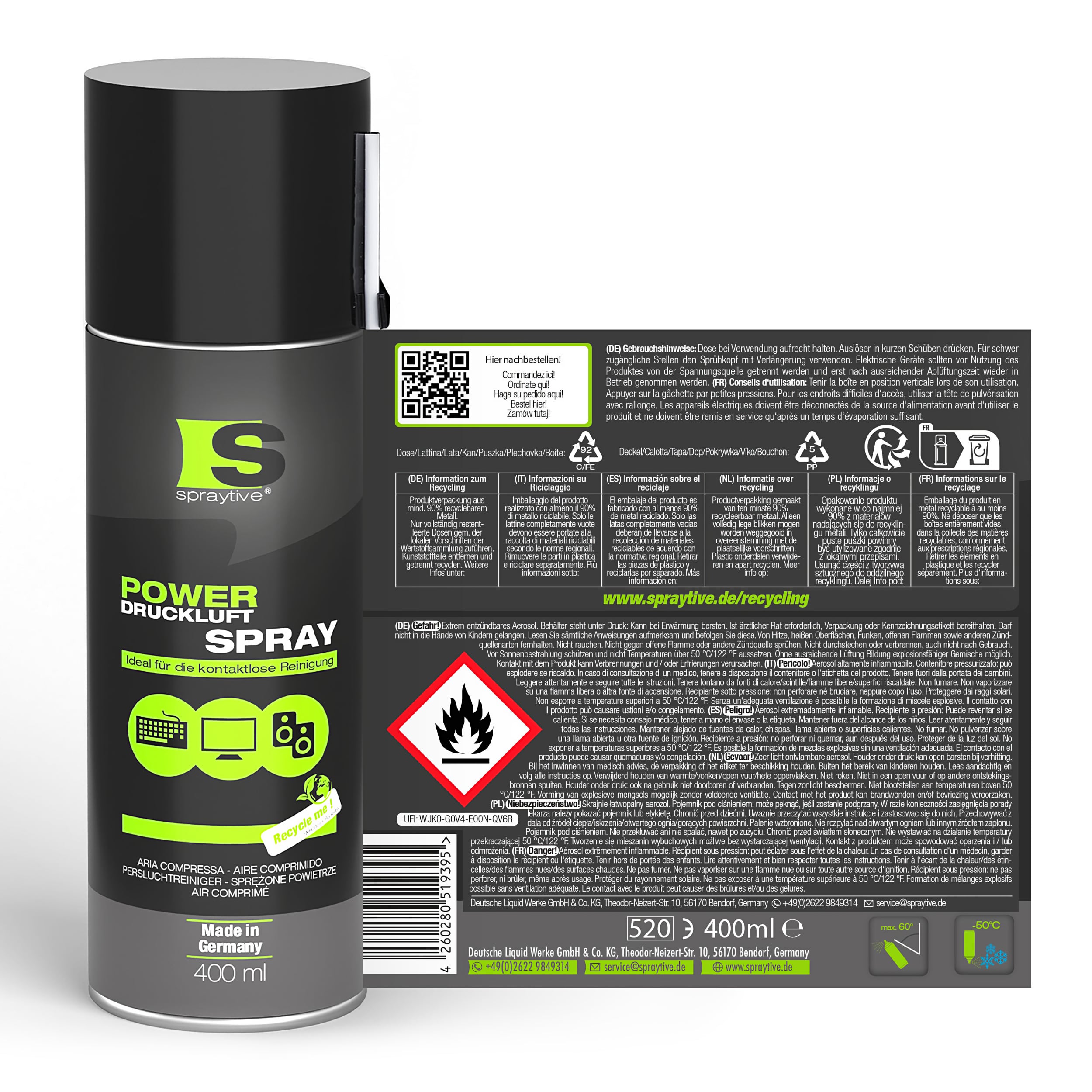 Das Spraytive Power Druckluftspray bietet eine kontaktlose Reinigungsmöglichkeit speziell für Multimedia- oder EDV-Geräten wie PCs, Computern, Notebooks oder Smartphones. Aber auch bei Spielekonsolen (Xbox, PS5), Kameras, Telefonen, Kopierern, Faxgeräten, TV-Geräten oder Uhrwerken findet das Druckluftspray häufig Anwendung.