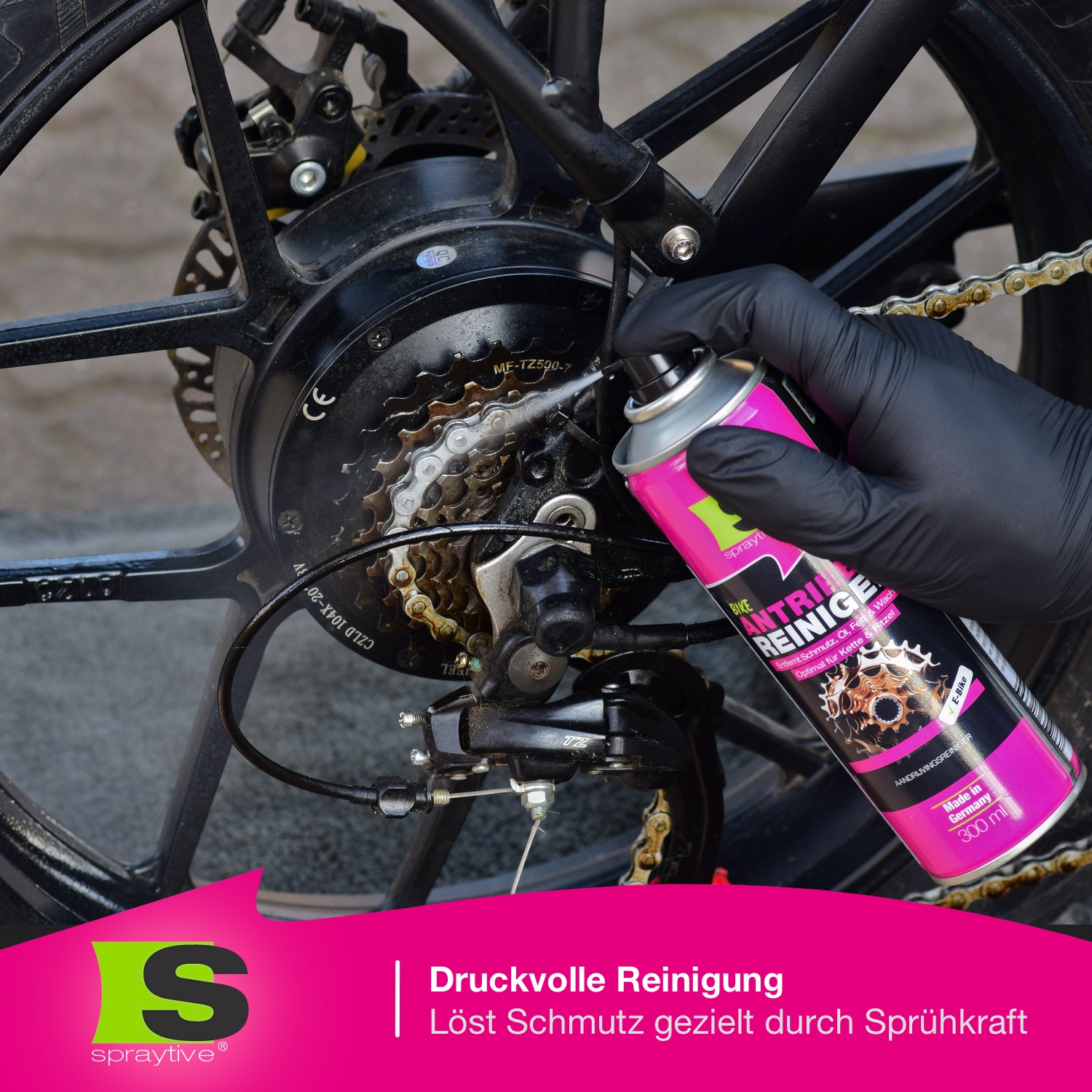 - Sprühdruck statt Pumpflasche: Spült Rückstände kraftvoll aus Kettengliedern und Ritzelzwischenräumen