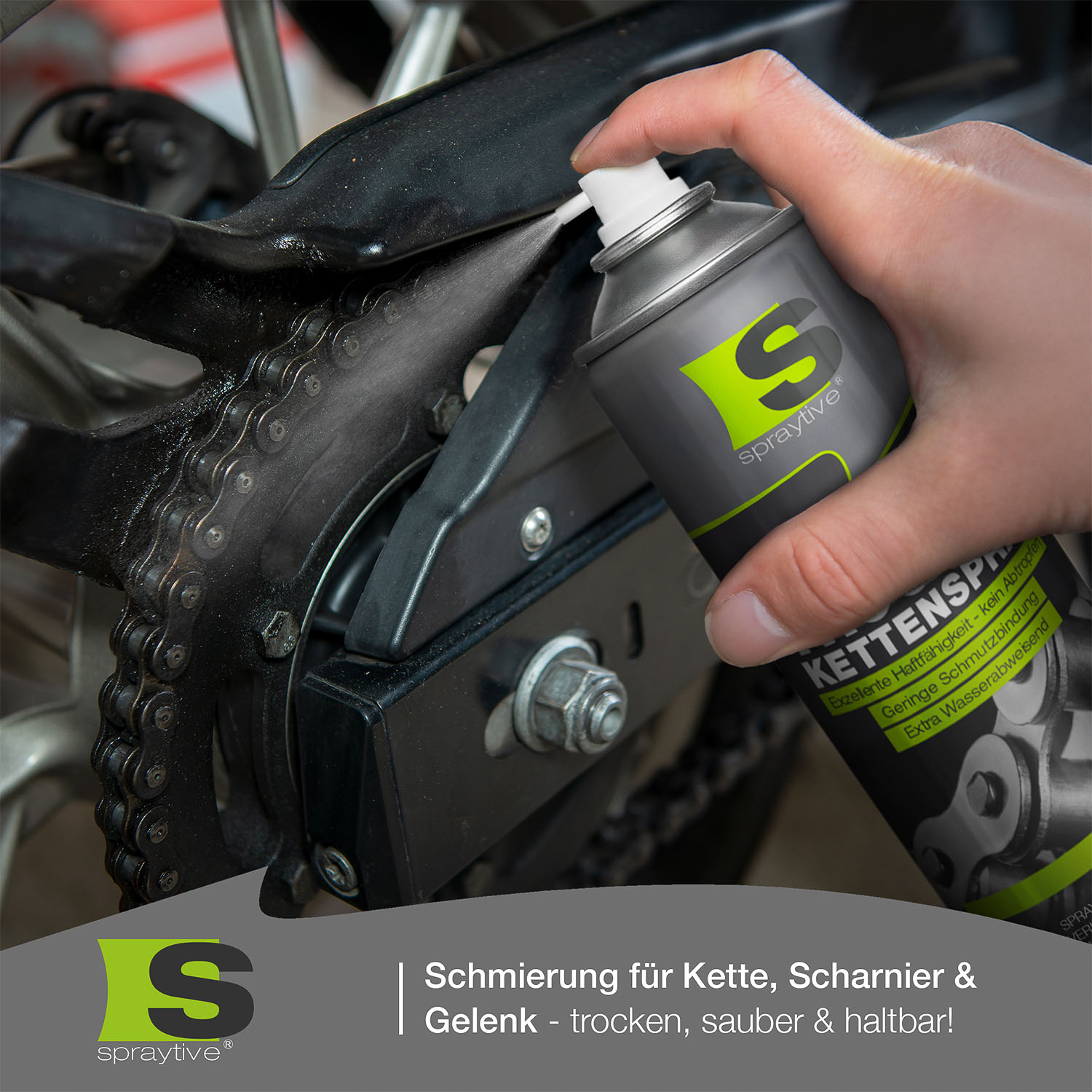 Das Spraytive Kettenspray ist ein hochwirksamer, teilsynthetischer Schmierstoff mit PTFE. Es schützt bewegliche Teile mit einem trockenen, haftstarken Film – ohne Abschleudern, auch bei hoher Belastung.